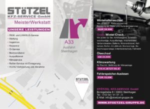 1. Mannschaft – An dieser Stelle wollen wir uns recht herzlich beim Sponsoring der Firma Stötzel Kfz-Service bedanken, die die Erste Mannschaft mit einheitlichen Sporttaschen ausgerüstet hat. Die Meisterwerkstatt findet ihr in direkter Queller Nachbarschaft: nämlich an der Borsigstraße 8 in Steinhagen. Sie bieten verschiedene Leistungen rundum PKW, LKW und Bus an. Aber seht einfach selbst: