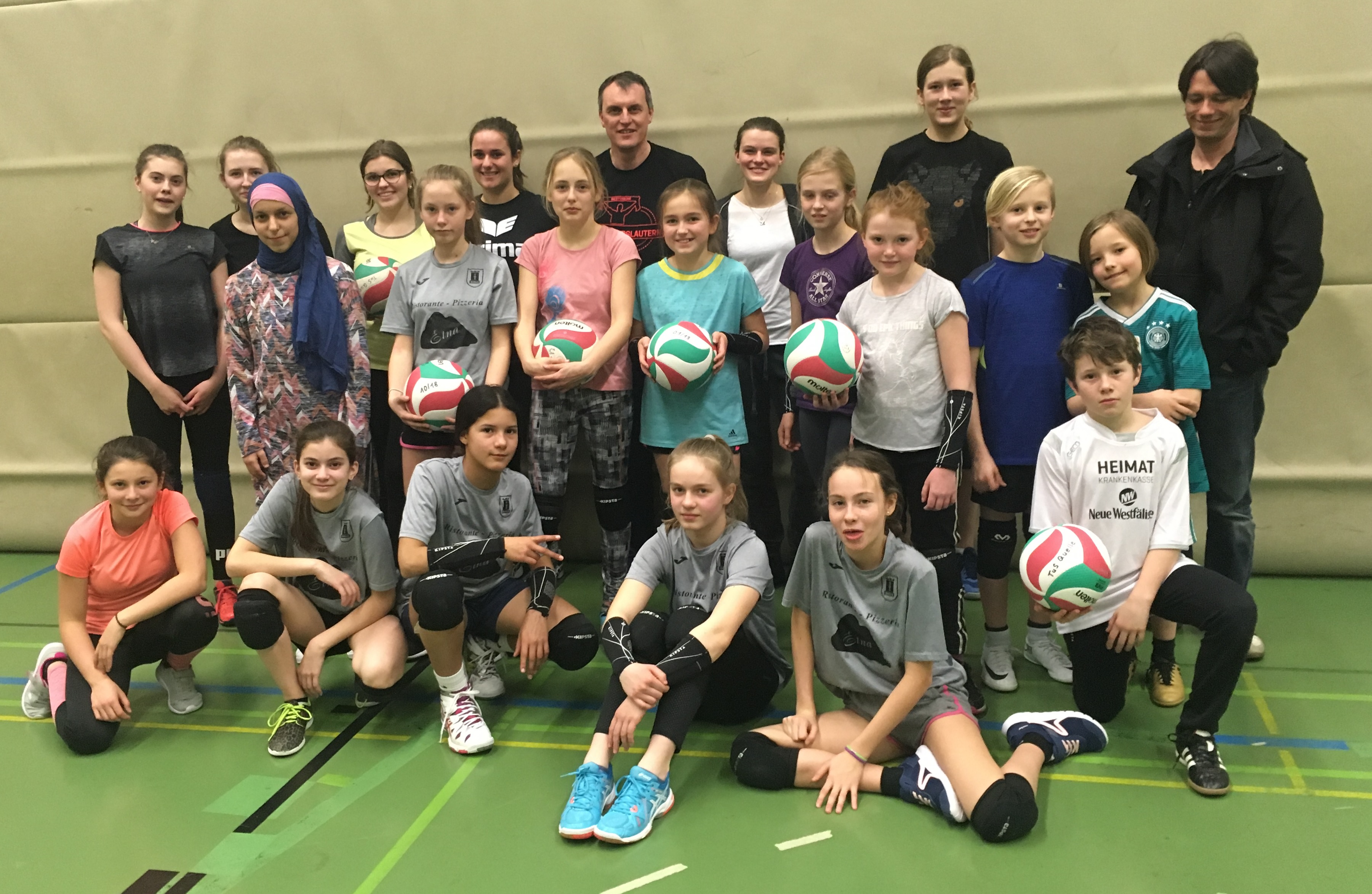 Der Trainer erklärt der Gruppe die nächste Übung. Es geht um die richtige Technik des oberen Zuspiels. Der Ball soll angeworfen und in der richtigen Handhaltung des Pritschens gefangen werden.
