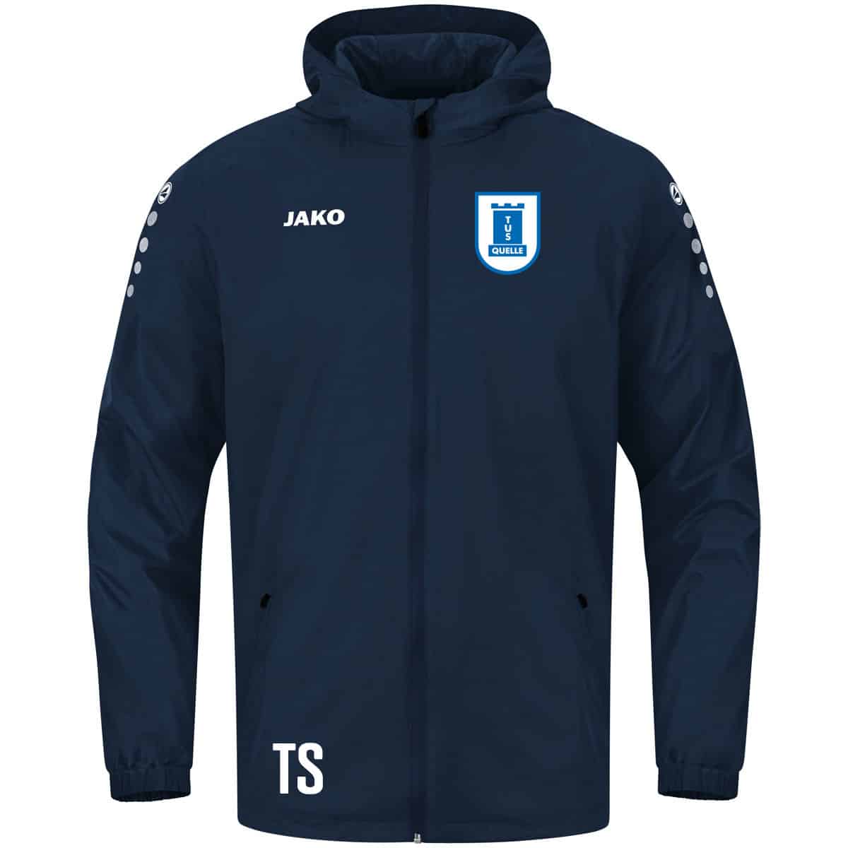 Bleib bei Wind und Wetter einsatzbereit – mit der TuS Quelle Allwetterjacke! Diese Jacke in marineblau bietet dir optimalen Schutz vor Regen und Wind, damit du auch bei schlechtem Wetter zeigen kannst, wofür dein Herz schlägt. Das wasserabweisende Obermaterial mit PU-Beschichtung hält dich trocken, während der verlängerte Rücken und die elastische Kapuze zusätzlichen Schutz bieten. Praktische Reißverschlusstaschen sorgen dafür, dass deine Wertsachen sicher verstaut sind. Zeige deinen Teamspirit bei jedem Wetter mit der TuS Quelle Allwetterjacke!